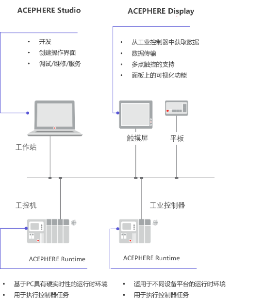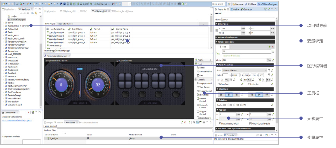 集成在ACEPHERE開發環境中的可視化編輯器,允許用戶基于可用的可視化元素創建任意數量的復雜操作界面。可以用于簡單的機器操作以及遠程維護、監視和診斷。應用于成千上萬的應用程序,不同的行業,各種顯示設備 — 如工業平板電腦、智能手機、控制器等。