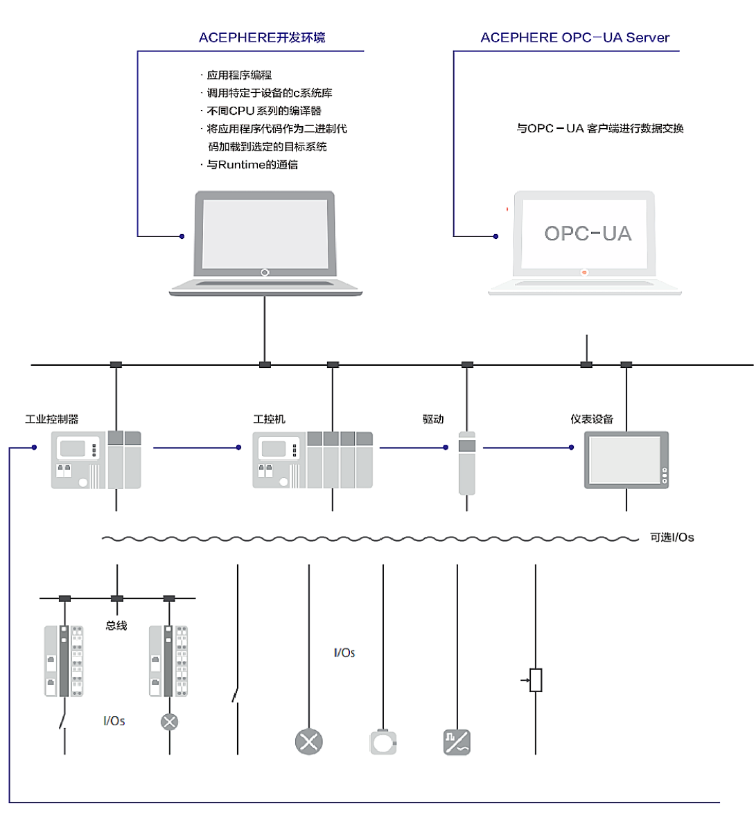 ■ 為ACEPHERE項目添加必要的總線系統:支持CANopen、EtherCAT,以及其它標準系統,如步進驅動器和模擬控制驅動器